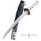 Le fourreau est en bois laque noir avec symbole de l'ile et ornement en acier a l'extremite.