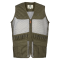 80% polyester, 20% coton. Filet d'aération 100% polyester. Renforts aux épaules. 2 grandes poches basses fermées par pressions. Cartouchières extérieurs 16 tubes. Carnier avec doublure étanche et lavable
