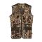 100% polyester, traité déperlant, doublure filet 100% polyester. Renforts aux épaules, filet d'aération dans le dos. 2 grandes poches basses, fermeture à pressions, cartouchières extérieures 18 tubes, 2 poches intérieures, anneau porte-gibier et carnier avec doublure étanche et lavable.