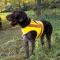 Gilet de signalisation pour chien: de couleur jaune avec des bandes rouge fluo et réfléchissantes. Réglable individuellement grâce à la fermeture velcro. En nylon lavable.