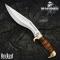 Sa lame incurvée de 26,5 cm en acier inoxydable J420 assure une coupe nette et durable, parfaite pour le hachage, la coupe et les travaux de terrain. Le manche, réalisé en cuir empilé à la main, offre une prise en main sûre et confortable, rehaussée par un pommeau et une garde en laiton poli du plus bel effet.