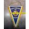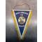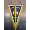 Design : Forme triangulaire (pointe vers le bas) sur fond bleu marine profond avec bordure bleu ciel.