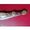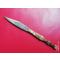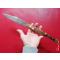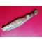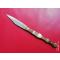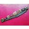 Très beau grand couteau type Navaja,fin XIXe ou début XXeme,lame acier en bon état (pointue,non émoussée, pas aiguisée), manche corne (ou écaille tortue,je ne sais pas ?) et laiton,nombreux rivets et fleurs décoratives en laiton,mitres laiton,un monogramme de chaque coté du manche (sans doute ceux d'un précédent propriétaire) ,aucun manque ni fentes,ressort ferme,aucun jeu,longueur totale 40cm,fermé 22cm,lame 18,5 cm,tbe.