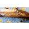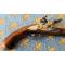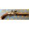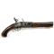 Magnifique et fort pistolet à silex fabriqué par John Drew à Mittau (ancien duché de Courlande, aujourd'hui Jelgava en Lettonie). Il est doté d'un canon conique en fer robuste, portant la signature « JOHN DREW » en lettres capitales hachurées sur le dessus. Le corps de platine porte le nom de la ville « MITTAU », également en lettres capitales hachurées.Chien col de cygne massif bassinet fer à pans et un ressort de batterie vissé de l'intérieur intérieurement. Le pistolet est monté laiton,calotte de crosse en tête de carlin,contre-platine découpée à jour, Monture en noyer verni, se prolongeant jusqu'à la bouche du canon, la mise en bois des garnitures en bois sont rehaussées de discrètes gravures en relief formant une frise florale. Deux élégantes gouttes d'eau ou larme prolongent à l'arrière la mise en bois de la platine et de la contre-platine. Mécanisme fonctionnel avec maitre ressort de platine trés puissant témoignant de la parfaite maîtrise de son art du platineur. La relime de la tranche du corps de platine et du corps du chien porte deux filets en relief encadrant une époustouflante nervure en" jonc " convexe d'un remarquable qualité d'exécution.Baguette bois à embout en laiton.