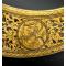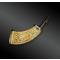Corne gravée d’un portrait d’un chevalier en armure dans un cartouche, de rinceaux et de motifs géométriques.