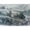 Belle gravure sur acier du XIX° siècle représentant une scène animée de chasse aux bisons dans les grandes plaines américaines. Composition spectaculaire : cavaliers lancés au galop dans de hautes herbes, troupeau en fuite, reliefs montagneux en arrière-plan. Le traitement du mouvement et la finesse du trait sont caractéristiques des planches illustrées destinées aux ouvrages de voyages et récits d’exploration publiés à Paris dans la seconde moitié du XIX° siècle.