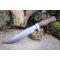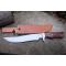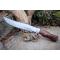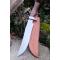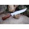 Couteau de chasse Bushcraft Survie à lame fixe - Longueur totale 41cm - Gros manche de 15cm - Longueur de lame 26cm - Lame en acier carbone 1055 - Lame type clip point plain edge - Finition satin - Manche en bois de rose - Mosaic pins - Garde en acier - Etui cuir - Fabrication artisanale