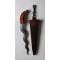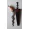 Garde en acier ,manche en dent de phacochère fini par une platine en acier termine par un boule elle aussi en acier . étui cuir très épais et binition cousu ,dragonne en acier de suspension type mousqueton .