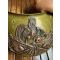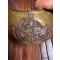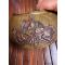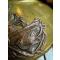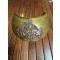 Plateau en laiton doré avec un motif en cuivre rouge représentant le coq gaulois tenant dans ses serres le globe terrestre frappé de l'inscription « FRANCE » et posé sur un faisceau de drapeaux un marqué LIBERTÉ et l'autre ORDRE PUBLIQUE liés par une couronne de laurier.