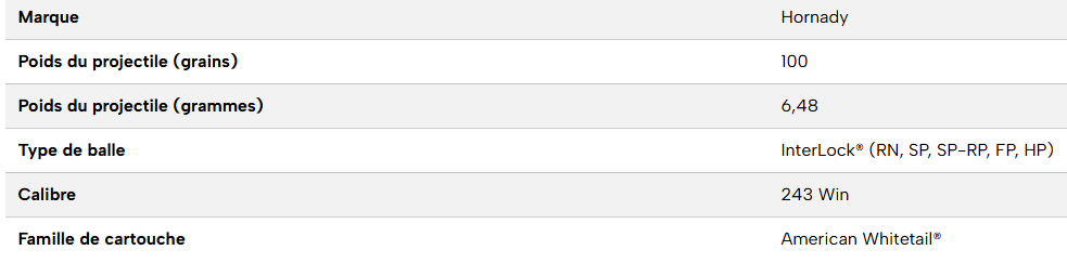 Chargées avec nos légendaires balles Hornady® Interlock®, favorites de la chasse aux cerfs depuis des décennies, les munitions American Whitetail® combinent les générations de savoir-faire balistique avec des composants modernes.