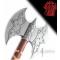 Superbe Hache Viking double Francisque de la marque DENIX. Lame double avec gravure. Manche en bois decore de lanière avec ornement en acier a son extremite richement decore. Longueur totale: 72 cm Dimension lame : 20cm x 20cm Poids: 1625 grs. Superbe pièce haute finition