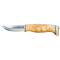 La lame, conçue en acier inoxydable X50CrMoV15 au profil drop point, assure un tranchant lisse et durable, idéal pour toutes vos aventures en nature. Le manche en bouleau frisé offre non seulement une esthétique unique, mais garantit également une prise en main confortable et sûre. Le pommeau fait de bois de renne complète ce design traditionnel.