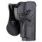 Initialement fournie avec le paddle, pour un port à la ceinture, le holster est compatible avec les accessoires permettant de l'installer sur des passants molle, ou encore sur une plateforme de cuisse (voir accessoires associées).