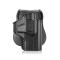 Étui en polymère avec déverrouillage du cavalier par bouton latéral. Équipé d’un pad latéral avec boucle de ceinture à insérer à l’intérieur du pantalon.