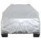 Housse de voiture SUV avec sangles à boucle complète argenté MCette housse de voiture SUV protège votre véhicule contre les rayons UV, la neige, la pluie, le gel, la poussière, les feuilles mortes, la pollution industrielle et les fientes d'oiseaux, ce qui la rend idéale pour une utilisation à l'intérieur et à l'extérieur. Protection pour toute saison : cette housse de voiture est fabriquée en polyester respirant avec un revêtement PU, ce qui garantit qu'elle est imperméable et qu'elle protège contre les UV pour une protection tout au long de l'année. Les coutures doubles renforcent sa solidité et sa durabilité.Revêtement argenté pour l'isolation thermique : la surface argentée de la housse de voiture reflète plus de lumière solaire et de rayons UV, ce qui permet à votre voiture de rester plus fraîche par temps chaud. Cela permet de protéger l'intérieur de votre voiture contre les dommages causés par la chaleur.Conception coupe-vent : les bords élastiques de la housse garantissent un ajustement parfait à votre voiture, tandis que les sangles réglables avec boucles au bas de la housse la maintiennent en place, même par temps venteux.Facile à ranger : cette housse de voiture est livrée avec un sac de rangement pratique, ce qui permet de la ranger facilement lorsqu'elle n'est pas utilisée. Bon à savoir :Avant d'acheter, veuillez prendre les mesures précises de votre voiture afin de vous assurer que vous choisissez la bonne taille.