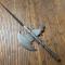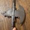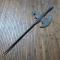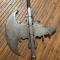 En fer forgé douille ferme quadrangulaire surmonté d'une forte pointe d'estoc quadrangulaire à pans, orné de deux fer forgé découpé l'un en forme de hache l'autre de croc avec gravure de trophées militaires, haches, casque , chevaliers en armure, feuilllages etc...