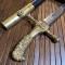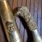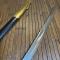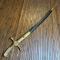 Le plat du dos est taillé en dents de scie sur 45 cm , fourreau en cuir vernis à deux grandes garnitures en laiton et bouton de chape à la tête de lion.