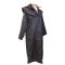 Imperméable long bleu, finition cape sur les épaules, capuche amovible, doublure à motif traditionnel : protection élégante contre la pluie, idéal pour la campagne et la ville.