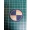 Support : La broderie est appliquée sur un fond en feutrine de laine bleu roi, qui reste visible pour former les deux quadrants bleus.