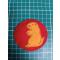 Support : Disque parfait en feutre de laine rouge écarlate (Scarlet Red). Le contraste entre le jaune du gaufre et le rouge du fond est saisissant et typique de l'iconographie colorée des Pioneer Infantry.