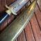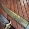 Garde laiton , lame légèrement courbe à doubles tranchants , dans son fourreau bois habillé de laiton gravé de motifs et signature ?