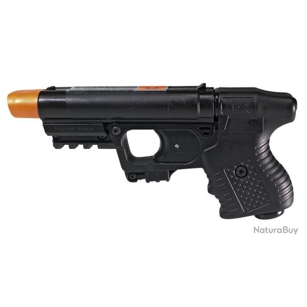 Le JPX® est un pistolet en polymère qui propulse une substance irritante appelée Capsicum Oléorésine (OC), extraite de plantes de poivre naturelles en très forte concentration. Il ne possède aucun accumulateur de pression mais un entraînement pyrotechnique identique à celui présent dans les systèmes d'airbag, permettant un fonctionnement par tous temps (-20 °C à + 80 °C) et dans toutes les positions sans perte de pression. La projection rapide de la substance irritante est propulsée à une vitesse de 120 m/s (430 km/h) ce qui permet d'exclure tout danger pour soi en cas d'utilisation dans le sens contraire du vent et propose une protection maximale grâce à sa portée efficace de 7 m. Longueur 190 mm, hauteur 90 mm, largeur 37 mm. Poids 250 g. Garantie 2 ans. Livré avec une cartouche de recharge 10 % OC.