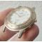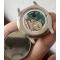 Aiguilles et trotteuse dorées, chiffres noirs sur cadran blanc.