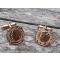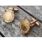 Très jolie paire de boutons de manchettes avec portrait de l'empereur sous forme de pièces de monnaie. Petit nettoyage à prévoir. Traces d'usage sur les pièces. Aucun marquage et aucun poinçon. Métal inconnu. Sans doute pas de l'or. Plaqué ou autre. Envoi rapide et soigné.