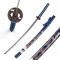 Katana déco style samouraï avec lame en acier, garde en métal avec dragon, sérigraphie avec dragon sur fourreau bleu.