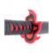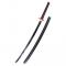Katana tranchant avec lame en acier au carbone AISI 1045 finie en noir, avec fourreau noir, garde en forme de flamme rouge, manche avec cordon en simili cuir noir sur fond rouge, avec boîte en bois doublée de tissu décoratif.