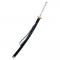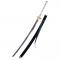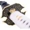 Katana tranchant avec lame en acier au carbone AISI 1045, avec fourreau en bois gainé de cuir noir (effet granuleux), poignée avec cordon blanc, garde en métal doré et noir, avec boîte en bois doublée de tissu décoratif.