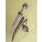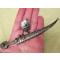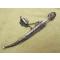 Joli petit kindjal courbe, travail caucasien de la fin du XIXe siècle. Lame en fer / acier avec gouttière centrale, monture et fourreau en argent niellé à décor de rinceaux. Le fourreau est marqué KAVKAZ (avec l'orthographe d'avant 1918) et poinçonné (poinçon argent 84). Attache en argent niellé en forme de fleur ornée d'un svastika enroulé (symbole solaire caucasien).