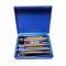 Kit de nettoyage compact en boîte plastique bleue, avec baguette en laiton démontable. Comprend trois brosses de nettoyage adaptées au calibre .22 : laiton, crin et laine, ainsi qu'un tube.