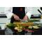 Le manche fin, en bois Pakka résistant, est présenté dans la forme traditionnelle japonaise de châtaigne. Les résines de haute qualité nourrissant le bois rendent le matériau particulièrement robuste et résistant à l'humidité. Sa forme typique de châtaigne garantit, grâce à une légère arrête sur le côté droit, une prise en main confortable et ferme lors de la coupe. La soie continue garantit stabilité et équilibre.