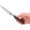 Grâce à sa forme symétrique, il convient à la fois aux gauchers et aux droitiers. Une soie sur toute la longueur assure stabilité et équilibre lors de la coupe. Détail particulier, l'extrémité du manche est gravée d'une tête de taureau Tim Mälzer, le signe distinctif du chef professionnel.
