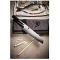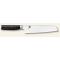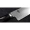 La finition brillante de la lame est sublimée par un grain Damas. Hybride entre un Santoku et un couteau de chef, sa forme spéciale est idéale pour un hachage précis. Les lames sont à double tranchant.
