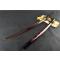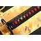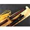 TSUKA:Le noyau Tsuka (poignée) est en bois et il est étroitement enveloppé sur une fausse peau rayée avec de la soie synthétique Ito. Le Fuchi (manche) et le pashira sont en alliage de zinc. Le Tang de l'épée est sécurisé par deux Mekugi (peg). Deux Menuki en cuivre (ornement) se trouvent de chaque côté du Tsuka.