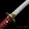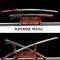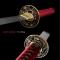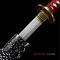 Katana en acier Damas, avec un design rouge et noir saisissant, combinant esthétique traditionnelle et modernité.