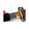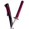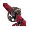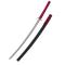 Sa poignée (tsuka) de 29 cm, recouverte de galuchat véritable et tressée d'un ito rouge en coton Hinerimaki, offre une prise ferme et confortable. La saya (fourreau) en bois laqué noir protège la lame et renforce le contraste visuel avec le rouge profond du tressage. Le tsuba (garde) de 8 cm, finement ouvragé, assure l'équilibre parfait entre la lame et la poignée.