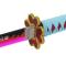 Le tsuka, façonné en bois de haute qualité, est recouvert d'un cordage synthétique bleu et sublimé par un same en simili cuir rose vif, garantissant une prise en main à la fois confortable et élégante.