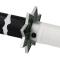 Le katana repose dans un magnifique fourreau bois recouvert de simili cuir noir avec des motifs blanc.