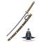 Le katana de Mikazuki Munechika est un personnage emblématique des manga, ce katana Mikazuki munechika est une oeuvre d'art forgée avec maestria. Ce sabre japonais incarne l'élégance et la puissance caractéristiques du légendaire guerrier. Sa lame est ornée d'une gravure détaillée représentant des motifs traditionnels japonais. La garde, magnifiquement décorée, reflète la noblesse et la grâce du personnage. Le manche est enveloppé d'un tissu doré tressé à la perfection, offrant une prise en main confortable et ajoutant une touche de sophistication. Le fourreau en bois laqué est finement travaillé, avec des motifs et des incrustations délicates.