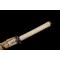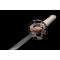 La lame est en acier T10 avec une trempe sélective à l'argile, créant un vrai hamon. La poignée est enveloppée de véritable peau de raie et de soie synthétique jaune. Le Tsuba est en laiton de haute qualité avec un motif de fleurs. Le fourreau (Saya) est en bois dur fini en noir brillant.