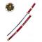 La tsuka (poignée) est recouverte d'un tressage rouge synthétique, assurant une prise confortable et un design soigné qui rappelle les véritables katanas japonais.