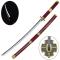 Avec son fourreau rouge décoré, sa garde dorée et sa poignée rouge tressée de noir, ce katana reprend fidèlement le style du sabre mythique. Allumé, il attire immédiatement le regard et sublime toute collection d’armes de manga.