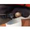 Bouton avec insigne de grenade sur la jugulaire en cuir noir.