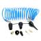 Le set comprend : un pistolet à air comprimé avec jauge de gonflage de pneus, une soufflette, un pistolet de pulvérisation avec godet, un pistolet pulvérisateur de peinture avec godet, un tuyau en spirale de 5 mètres et 8 buses différentes.