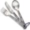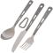 Comme son nom l'indique, le couvert Optimus Titanium 3 pièces, c'est en fait 3 couverts. Premièrement, on a une fourchette en titane. Deuxièmement, on a une cuillère en titane. Troisièmement, on a un couteau en titane. Et pour rassembler ou accrocher le tout, on a également un petit mousqueton très pratique. L'avantage du titane est évident : matériau simultanément ultra léger, costaud et respectueux de la santé (matériau certifié sans BPA et conforme pour un usage alimentaire).