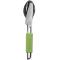 Ce set Primus comprend 3 couverts, à savoir une cuillère, un couteau et une fourchette. C'est un gage de qualité : les couverts Primus sont en acier inoxydable avec un finition irréprochable. De plus, ce set est assez léger (poids total : 85 grammes). Maintenus ensemble par un support en silicone résistant à la chaleur et facile à manipuler, ils occupent un espace de rangement optimal : 180 mm (longueur) x 35 mm (largeur) x 20 mm (épaisseur), s'adaptant ainsi facilement aux popotes classiques de trek. La teinte verte distinctive différencie ce set de couverts des autres kits appartenant à la collection Leisure Cutlery Set Primus.