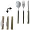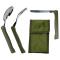 11,5 cm de longueur de manche et 20 cm de longueur totale, la taille de ces couverts pliables est parfaitement adaptée au monde du trekking et du voyage. Il en est de même pour le poids de ce produit : 220 grammes en comptant la housse. Le coloris vert kaki ou vert armée (avec logo CAO) se fond dans la nature. Toute la partie métallique aussi bien de la cuillère pliable, de la fourchette pliable ou du couteau pliable sont en acier inoxydable : matériau sain pour la santé, durable et anticorrosion. Les manches sont en plastique de type ABS (léger et solide). Remarque intéressante : pour un rangement compact et un gain de place maximal, rangez l'ensemble à l'intérieur de votre popote de camping (par exemple).